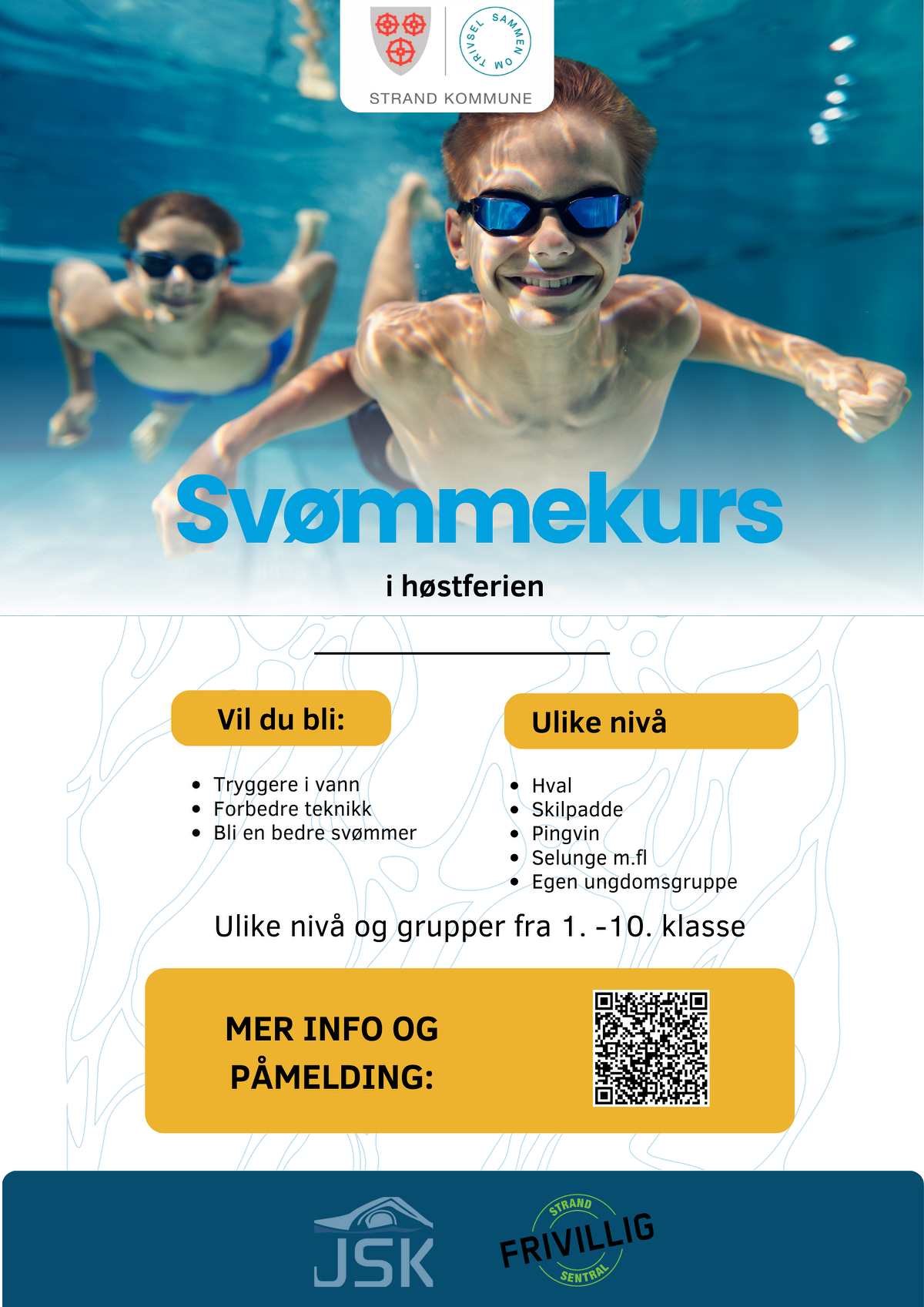Sammen med Jørpeland Svømmeklubb arrangerer vi intensiv svømmekurs i høstferien, mandag -fredag. For barn og ungdom i alderen 6.-16 år. Barna blir inndelt i grupper etter nivå og alder. Egen ungdomsgruppe. Dette kurset er for deg som ønsker å bli tryggere i vann, og som har lyst å bli litt flinkere å svømme. Påmelding via link: https://forms.office.com/e/xvxz9EbnjXAldersgruppe: 6 til 16 år
