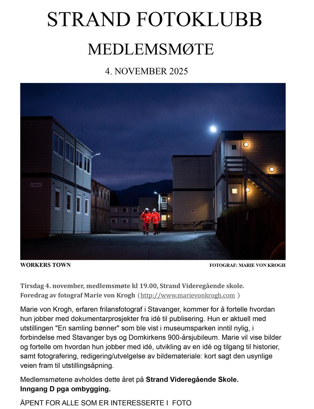 Strand fotoklubb sine medlemsmøter er åpne for alle som er interesserte i foto. Denne tirsdagen får vi besøk av Marie von Krogh, en erfaren frilansfotograf i Stavanger. Hun forteller hvordan hun jobber med dokumentarprosjekter fra idé til publisering.